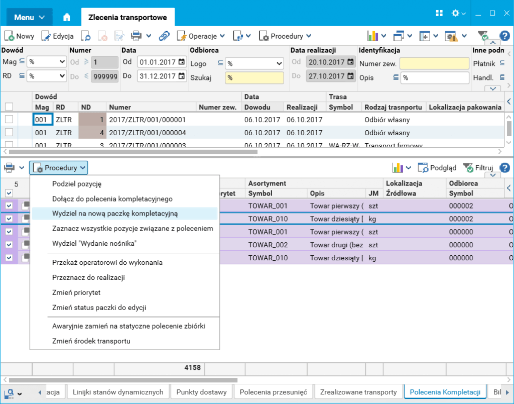 Rys. 2. Wydzielenie poleceń kompletacji na nową paczkę kompletacyjną