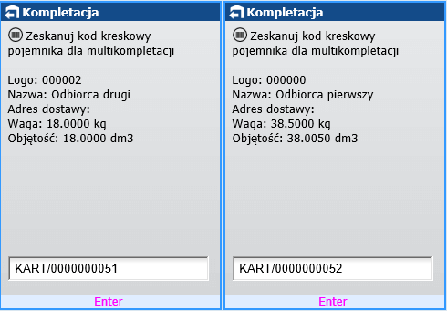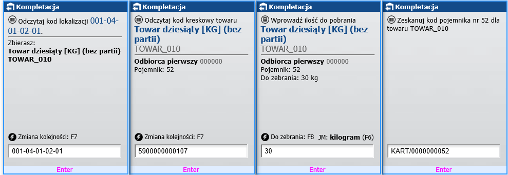 Następnie odbywa się standardowy proces kompletacji, jednak na każdym z ekranów wyświetlana jest dodatkowa informacja o tym, dla jakiego odbiorcy jest zbierana dana pozycja, oraz o numerze kartonu, do którego należy włożyć kompletowany towar. Odłożenie towaru do właściwego pojemnika potwierdzane jest poprzez wskanowanie kodu kreskowego naklejonego na pojemnik.
