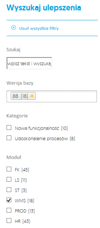 Dokładny opis wszystkich zmian wprowadzonych do wersji 88 można znaleźć w AVP, w zakładce Nowe funkcjonalności. Po wejściu do tej zakładki w filtrze Moduł należy wybrać moduł WMS, a w filtrze Wersja bazy – 88. Pozostałe filtry umożliwiają ustawienie dodatkowych kryteriów. Można np. wyszukać wyłącznie nowe funkcjonalności lub zmiany dotyczące użyteczności.