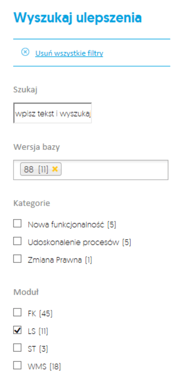 Rys. Filtry, które pozwalają wyszukać zmiany dotyczące systemu ERP w wersji 88