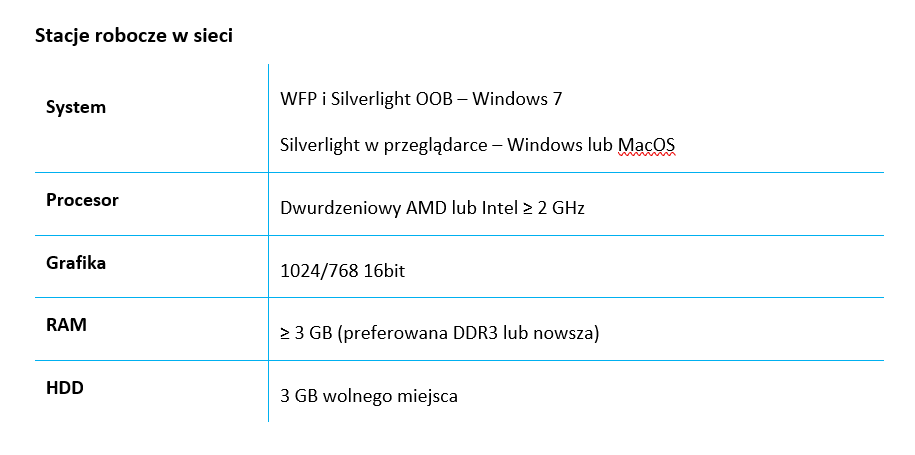 Pełny wykaz systemów operacyjnych oraz przeglądarek internetowych, które są kompatybilne z technologią Microsoft Silverlight, można znaleźć na stronie producenta: https://www.microsoft.com/getsilverlight/Get-Started/Install/Default.aspx.