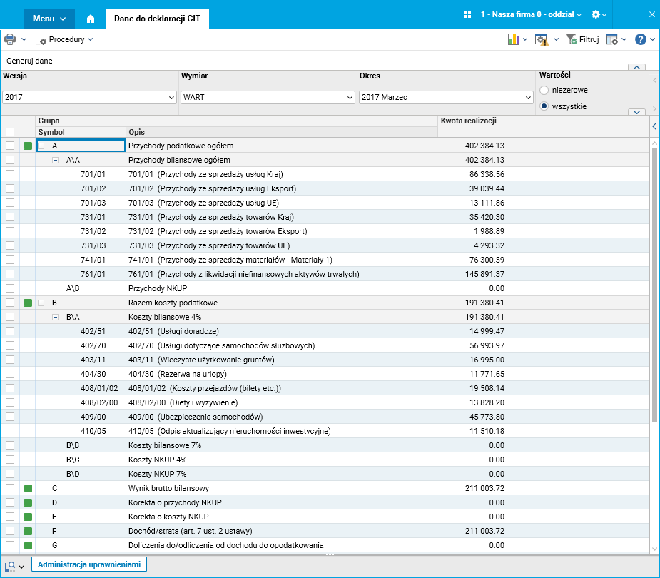 Na dzień sporządzenia deklaracji CIT księgowy może wygenerować i sprawnie zweryfikować dane niezbędne do przygotowania deklaracji w przeglądarce Dane do deklaracji CIT, bez konieczności przeszukiwania wielu innych słowników. Wystarczy, że uruchomi procedurę Generuj dane w ww. słowniku, aby otrzymać gotowy zestaw wartości. Dzięki temu użytkownik oszczędza czas, który może przeznaczyć na wykonywanie innych ważnych dla organizacji zadań.