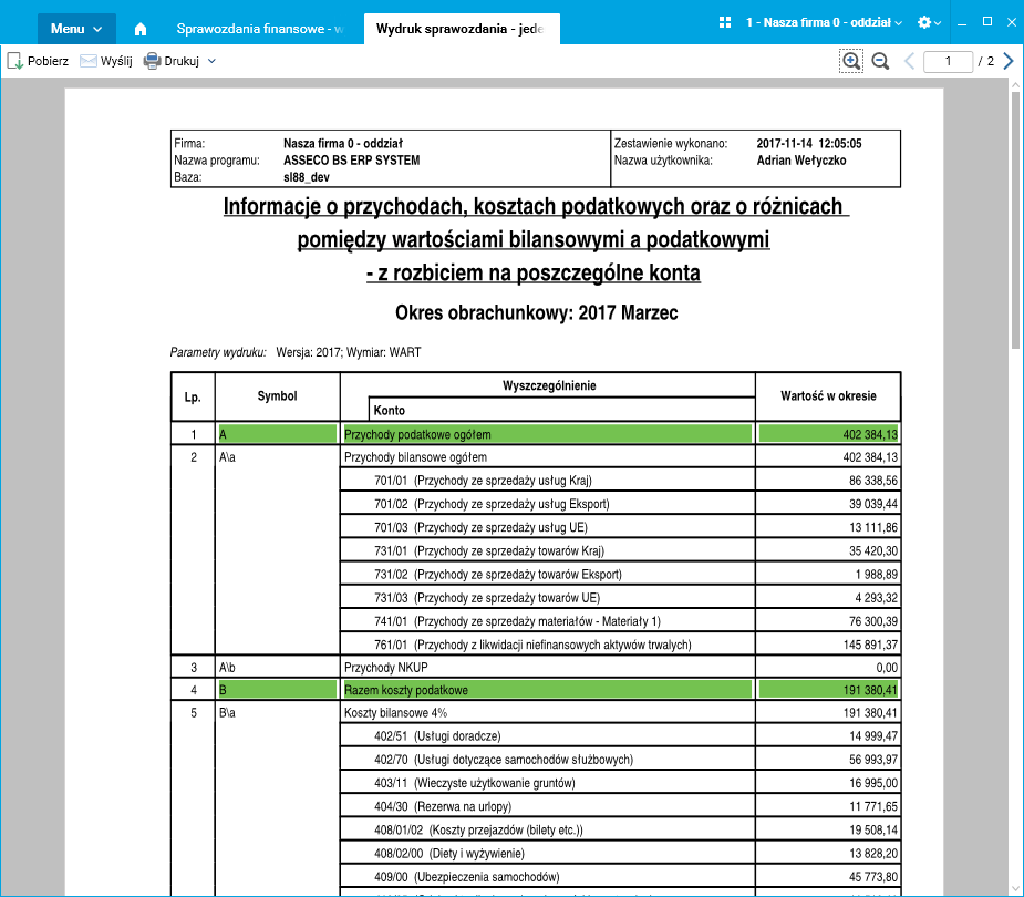 Kwoty w rozbiciu na poszczególne konta księgowe można zobaczyć także na dedykowanym wydruku Wydruk sprawozdania – jeden okres wg kont.