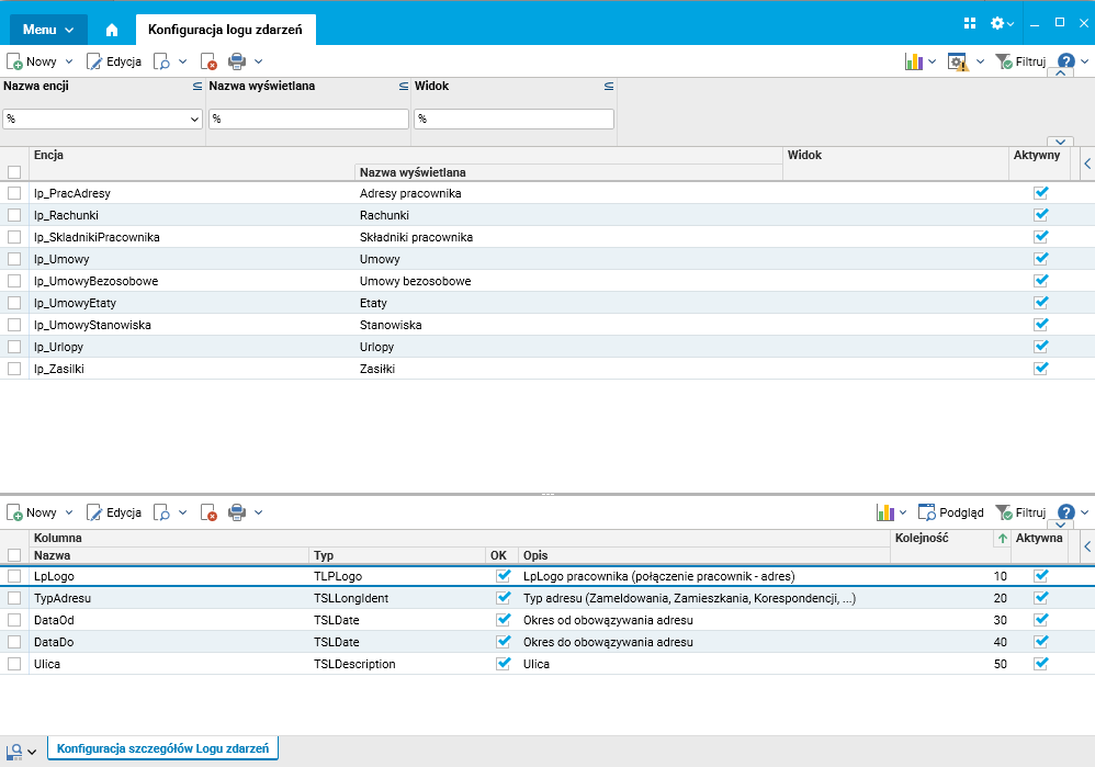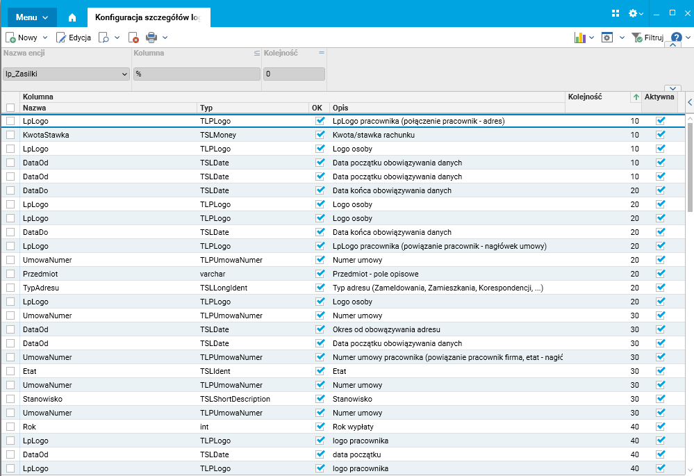 1. W słowniku Konfiguracja szczegółów logu zdarzeń zdefiniowane są kolumny odpowiednich tabel – wskazanych w słowniku Konfiguracja logu zdarzeń – których historia zmian ma być widoczna dla administratorów. Celem tej definicji jest ograniczenie liczby analizowanych zmian do istotnych dla klienta kolumn danej tabeli. Wynika to z tego, że nie wszystkie kolumny danej tabeli zawierają dane o podobnej wadze znaczeniowej i pokazywanie zmian we wszystkich kolumnach zmniejszałoby czytelność informacji dla administratorów.