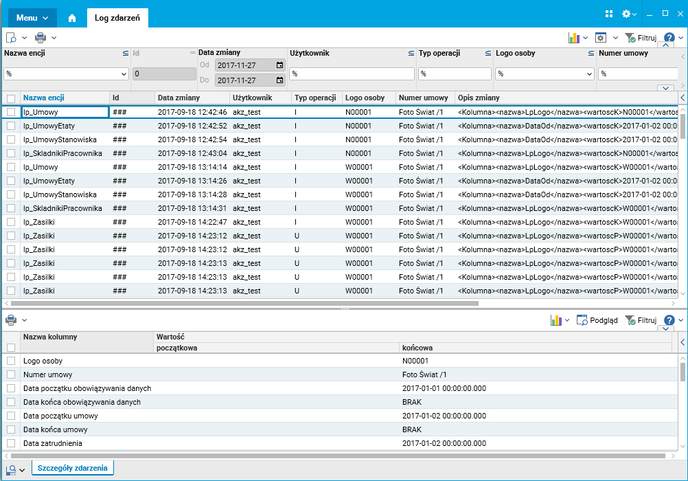 1. W słowniku Log zdarzeń prezentowane są dane o zmienianych wartościach w zdefiniowanych kolumnach wybranych w konfiguracji tabel.