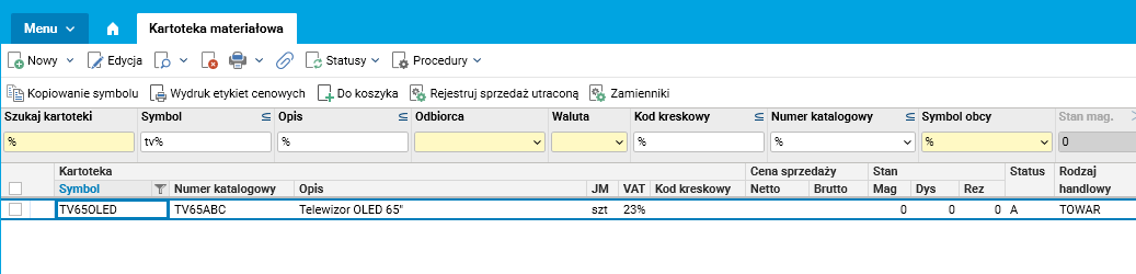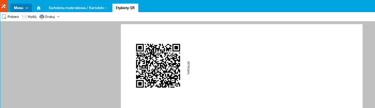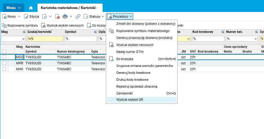Z poziomu słownika Kartoteka materiałowa, gdzie dostępna jest procedura Wydruk etykiet QR