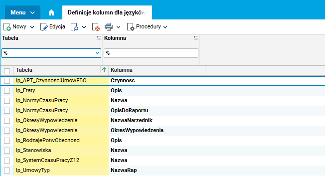 W kolejnym kroku w słowniku Definicje kolumn dla języków, za pomocą akcji Nowy, należy dodać odpowiednie tabele i kolumny tych tabel (po jednym rekordzie na każdą kolumnę słownika), które mają być przetłumaczone w tych tabelach (podana kolumna musi istnieć w tabeli i nie może to być zupełnie nowa kolumna).
