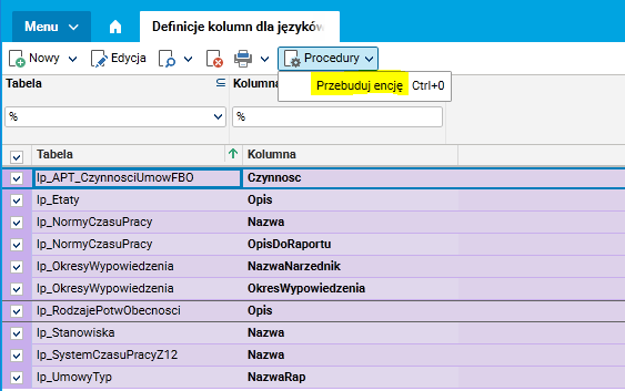 W słowniku znajduje się procedura Przebuduj encję. Po wprowadzeniu definicji należy zaznaczyć wprowadzone rekordy i uruchomić tę procedurę.