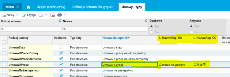 Nowe kolumny zostały dodane do wszystkich wybranych tabel. Tłumaczenia danych można uzupełniać bezpośrednio z aplikacji.