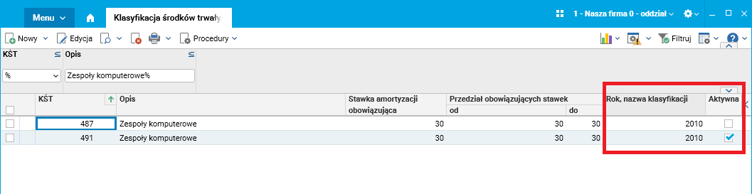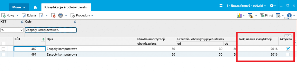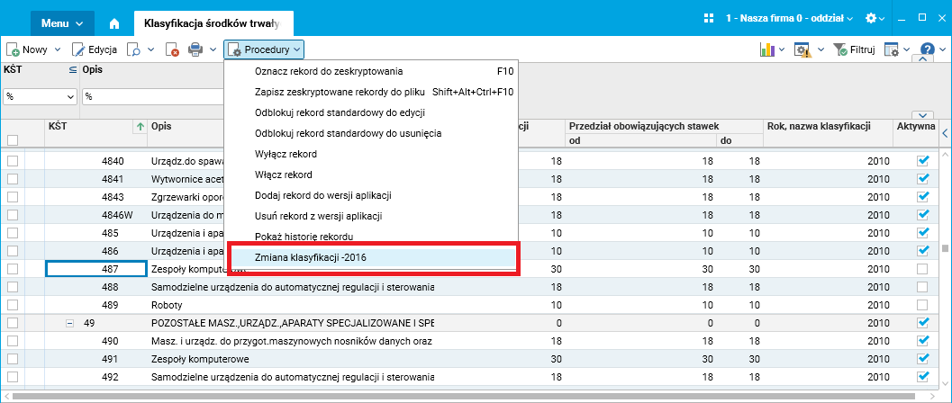 - Uaktualniono słownik Klasyfikacja środków trwałych, dodano nowe grupy KŚT 2016, dodano status Aktywny i oznaczono nim grupy, które są aktywne w KŚT 2010. W słowniku dodano procedurę Zmiana klasyfikacji 2016 pozwalającą na przejście na KŚT 2016 w styczniu 2018 roku.