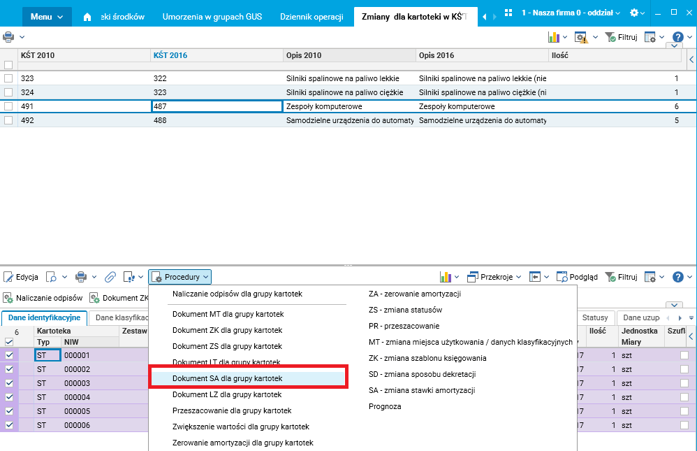 Z poziomu słownika widoczna jest grupa z KŚT 2010, odpowiadająca jej grupa z nowej klasyfikacji oraz ilość kartotek z grupą, którą trzeba zmienić. W szczegółach widoczne są kartoteki z daną grupą KŚT, którą należy zmienić na grupę KŚT 2016. Zmian dokonujemy uruchomiając procedurę Dokument SA dla grupy kartotek dla wszystkich znajdujących się w szczególe Kartoteki środków pozycji.