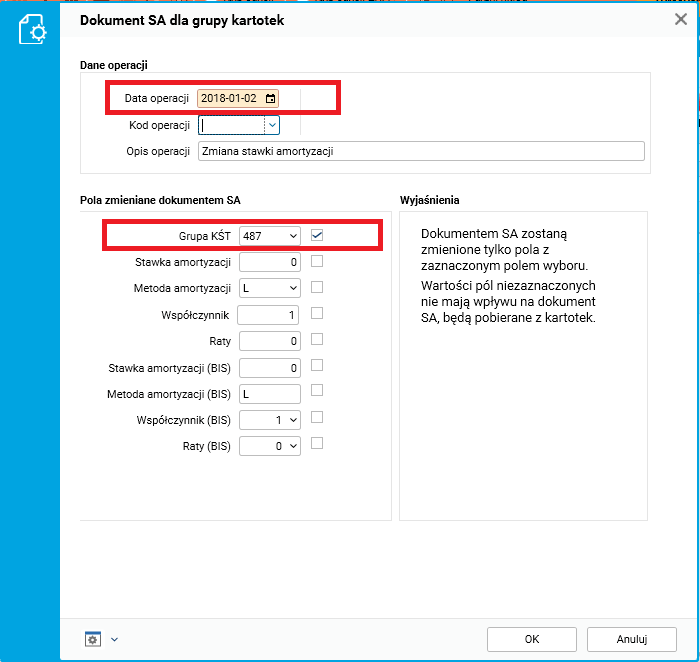 Po uruchomieniu procedury pojawia się formularz, w którym należy wybrać datę dokumentu 2018-01-02, w polu grupa KŚT należy podać nową grupę 487 i zaznaczyć pole zmiana przy grupa KŚT. Pozostałe pola zmian pozostawiamy niezaznaczone.