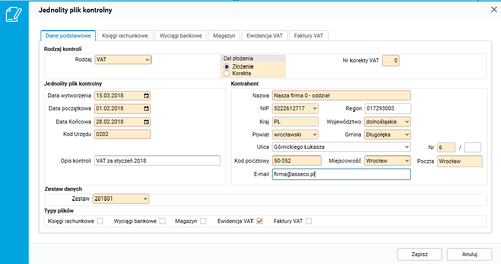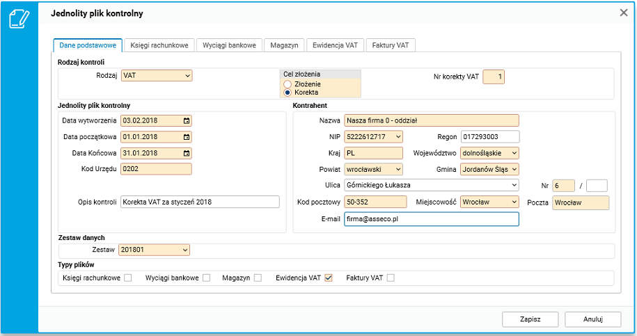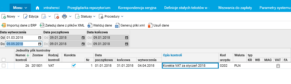 Datę początkową ustawiamy więc na 01.01.2018, datę końcową na 31.01.2018. Zestaw danych ustawia się automatycznie na 201801. Jest to pierwszy dokument z tego miesiąca więc Nr korekty VAT zostaje ustawiony na 0.