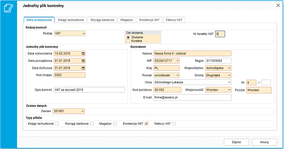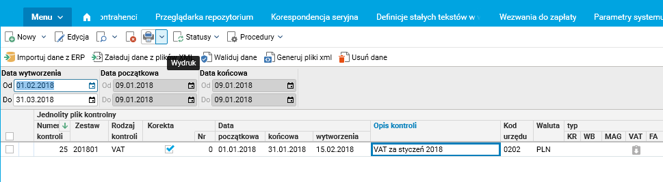 Rys. 2 Jednolity plik kontrolny – przygotowanie nagłówka dokumentu dla VAT za styczeń 2018