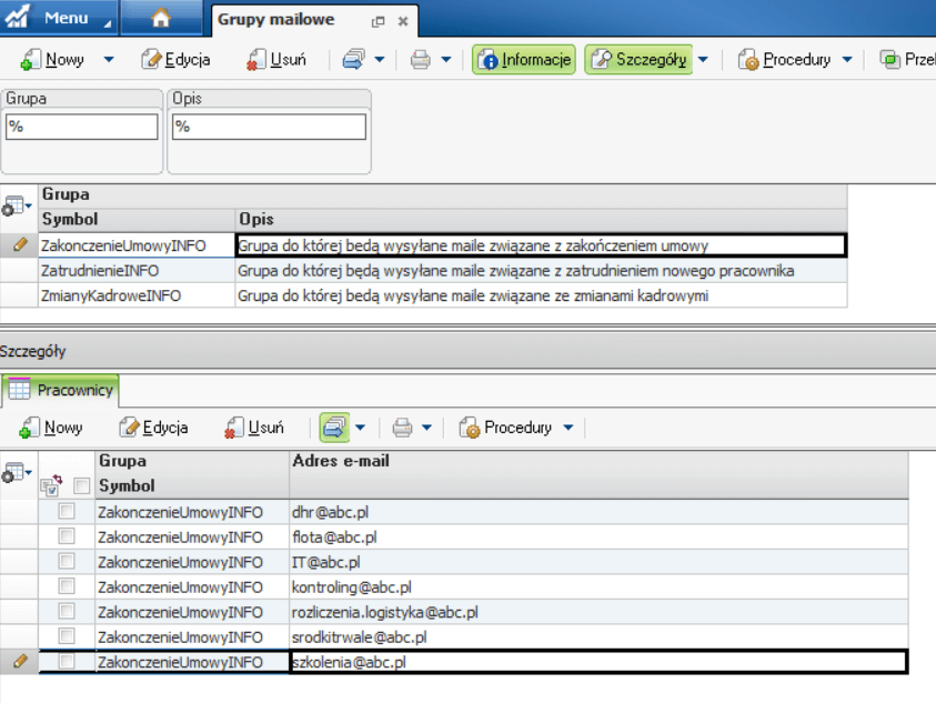 Użytkownicy systemu mogą tworzyć grupy mailowe w systemie. Pozwala to na uwzględnienie odpowiednich osób lub działów w mailingu. Przykładowo, informacja o zakończeniu umowy z pracownikiem powinna dotrzeć do administracji, działu IT lub działu rozliczeń – dział HR może to swobodnie definiować.