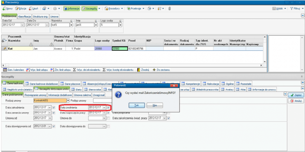 Rys. 2. Informacja o wysłaniu maila – zwolnienie pracownika