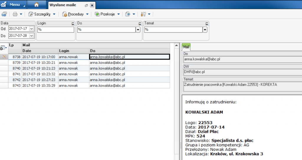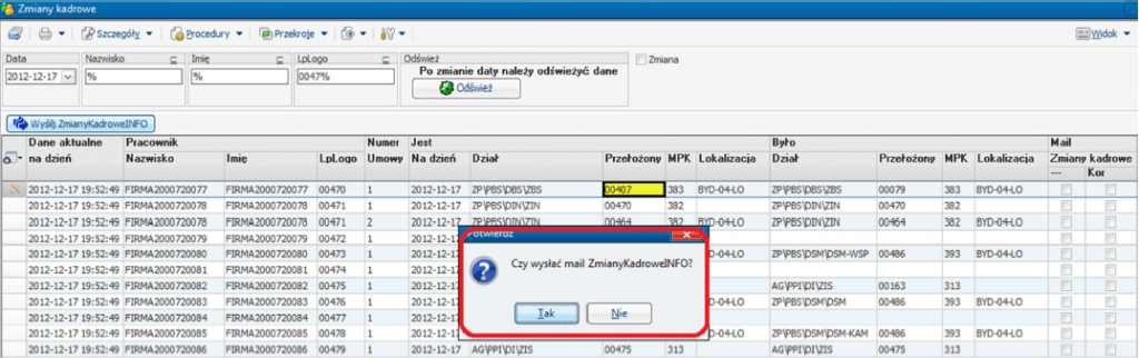 W przypadku przesunięć pracowniczych pomocna jest przeglądarka Zmiany kadrowe. Tak jak w opisanych powyżej przypadkach umożliwia ona automatyczne wysłanie maila do odpowiednich osób/działów. Dzięki przeglądarce użytkownik nie musi sprawdzać informacji w różnych słownikach systemu. Pełna informacja znajduje się już w jednym miejscu wraz z opisem poprzednich i aktualnych danych. Skraca to czas przygotowania danych dotyczących zmian kadrowych do wiadomości mailowej.