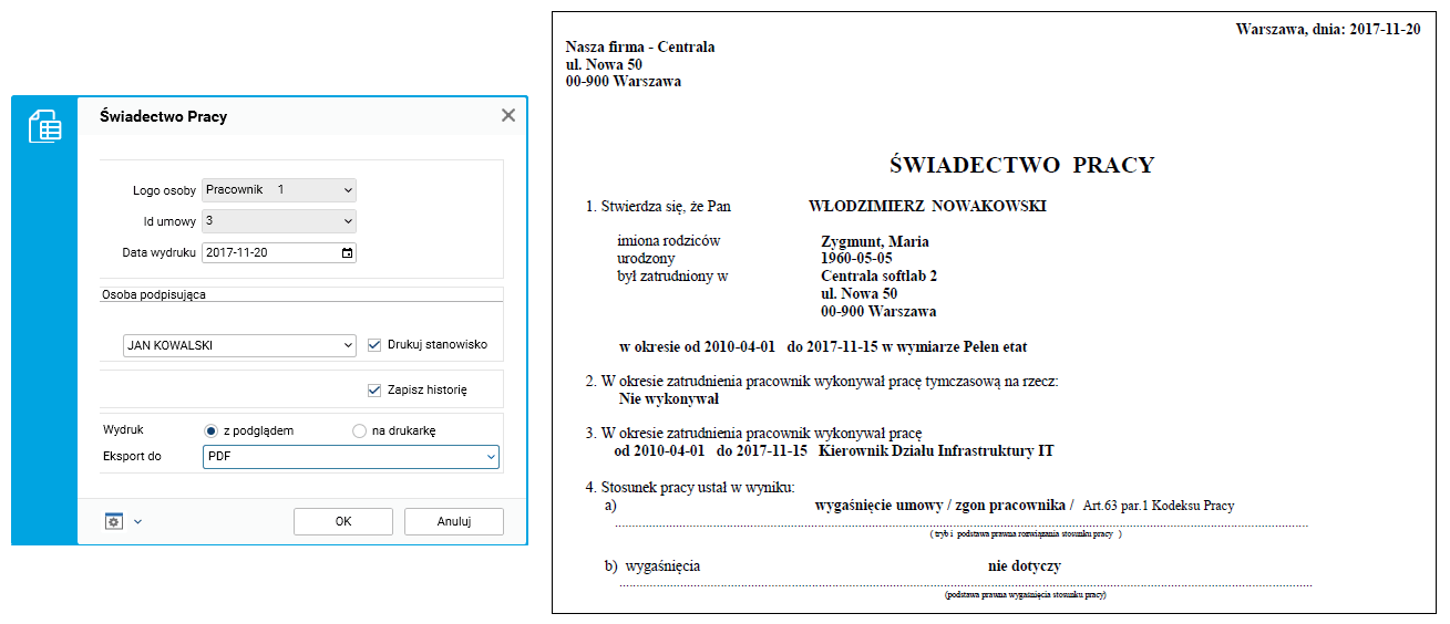 Rys. 10. Wydruk świadectwa pracy po akceptacji rozwiązania stosunku pracy
