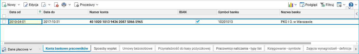 • zamknięcie konta/kont bankowych pracownika poprzez uzupełnienie daty obowiązywania do,