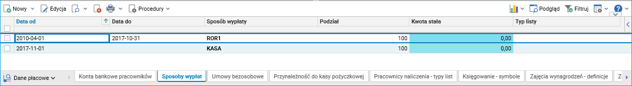 Rys. 12. Zmiana sposobu wypłaty w szczególe Sposoby wypłat słownika Pracownicy – umowy(etaty)