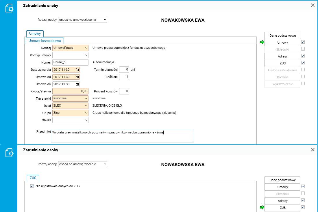 Pracodawca rejestruje dane spadkobierców oraz dane umowy do wypłaty praw majątkowych, korzystając z procedury Zatrudnianie osoby, dostępnej w słowniku Fundusz bezosobowy – zatrudnianie.