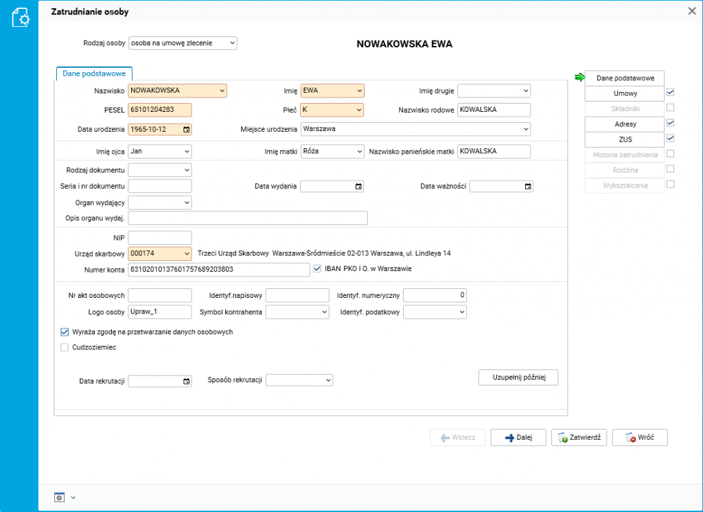Przykładowa rejestracja rachunku dla żony zmarłego pracownika (dla córki proces będzie analogiczny):