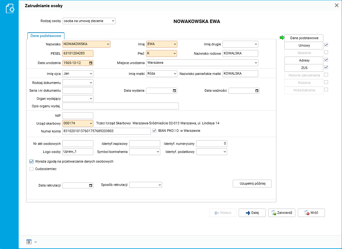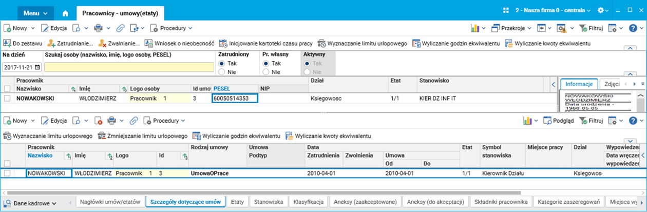 Rys. 1. Szczegóły dotyczące umowy w słowniku Pracownicy – umowy(etaty)