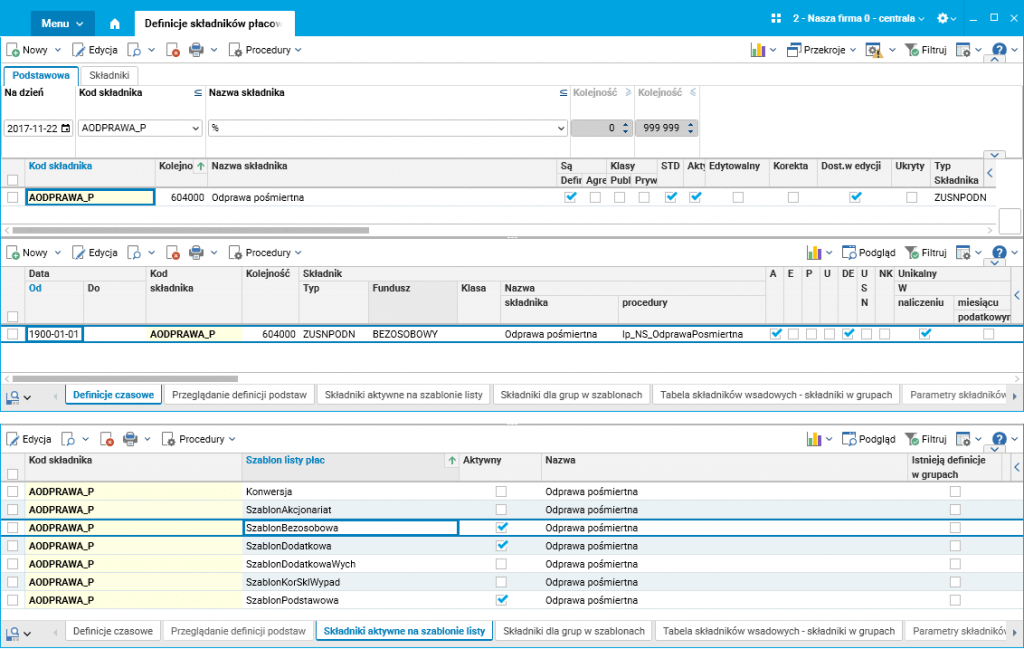 • skonfigurować składnik AODPRAWA_P dla odprawy pośmiertnej jako dostępny w funduszu bezosobowym oraz aktywny na bezosobowym szablonie listy płac.