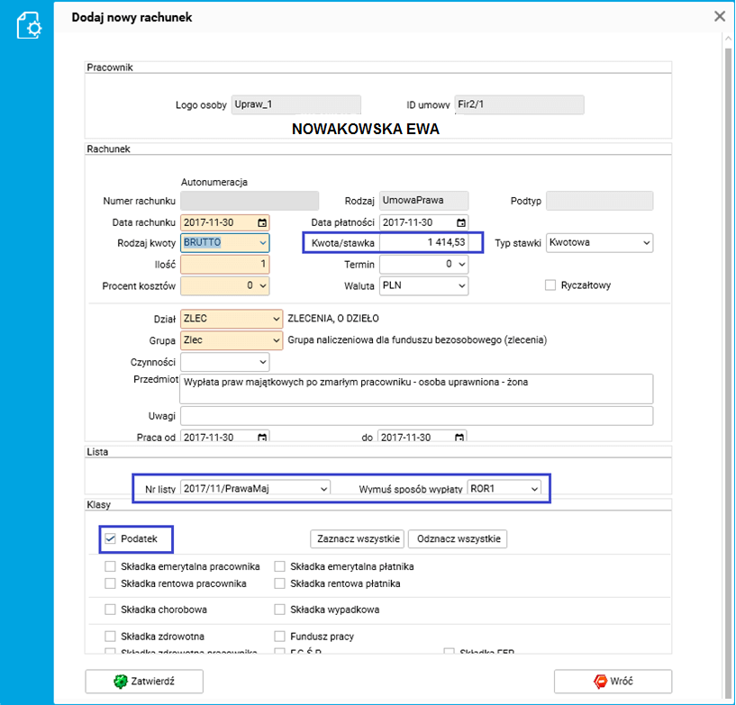 Jako kwotę rachunku dla żony/córki należy podać połowę kwoty wynagrodzenia zmarłego pracownika, czyli połowę kwoty 2829,05 zł (wynagrodzenie za chorobę 230,10 zł + zasiłek chorobowy 460,20 zł + ekwiwalent za urlop 2138,75 zł). Kwota będzie opodatkowana, nie będą odprowadzone składki ZUS. Należy wybrać wcześniej stworzoną listę płac wraz z odpowiednim sposobem wypłaty.