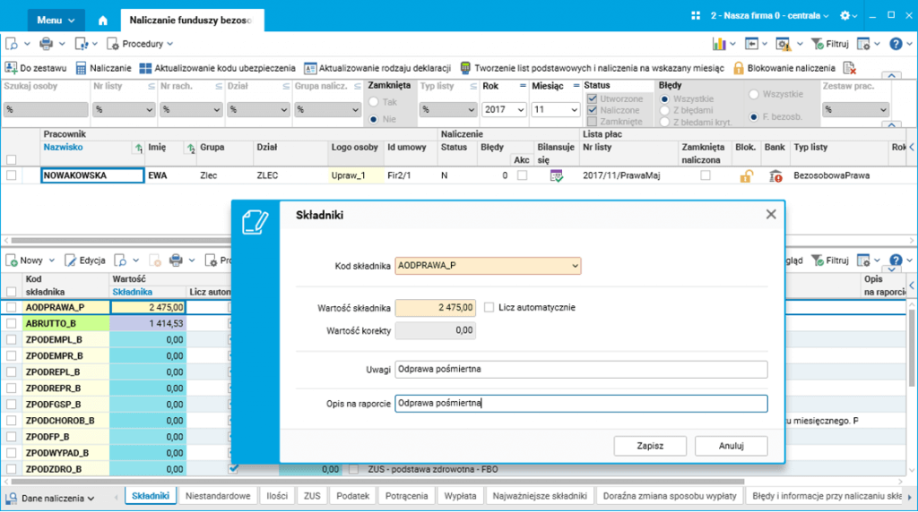 Po naliczeniu rachunków w szczególe Składniki słownika Naliczanie funduszy bezosobowych, pracodawca dodaje do naliczenia skonfigurowany wcześniej składnik AODPRAWA_P dla odprawy pośmiertnej. Składnik ten należy dodać w wysokości połowy przysługującej kwoty odprawy, czyli połowy kwoty 4950 zł dla żony oraz córki. Kwota ta nie będzie opodatkowana i nie będą odprowadzone składki ZUS.