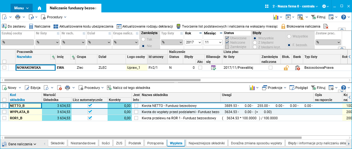 Pracodawca wykonuje naliczenie rachunków w słowniku Naliczanie funduszy bezosobowych.