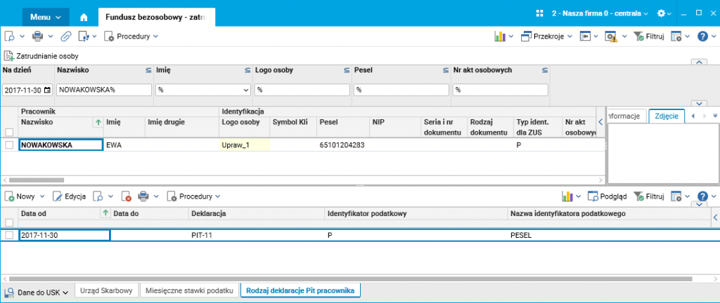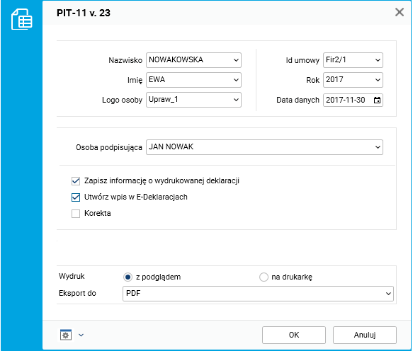 Dla osób uprawionych, które otrzymały po zmarłym należne mu wynagrodzenie (w tym wypadku dla żony oraz córki) należy wystawić deklarację PIT-11 za rok 2017. Należy dla tych osób wprowadzić właściwy urząd skarbowy oraz rodzaj deklaracji PIT w szczególe Rodzaj deklaracji Pit pracownika w słowniku Fundusz bezosobowy – zatrudnianie.