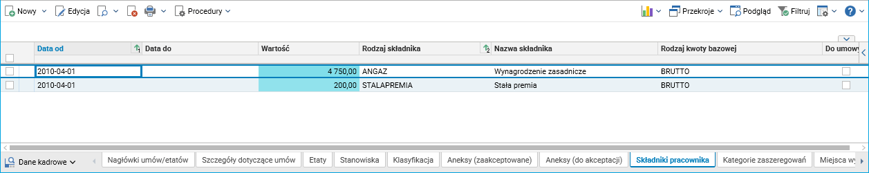 Rys. 2. Składniki pracownika w słowniku Pracownicy – umowy(etaty)