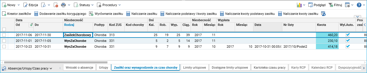 Pracodawca skrócił okres listopadowego zasiłku chorobowego do dnia zgonu, 15 listopada 2017 roku, poprzez korektę zasiłku w szczególe Zasiłki oraz wynagrodzenia za czas choroby w słowniku Pracownicy – umowy(etaty):