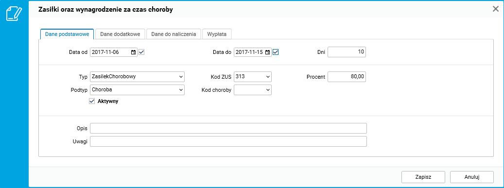 Rys. 4. Zasiłki oraz wynagrodzenie za czas choroby w słowniku Pracownicy – umowy(etaty)