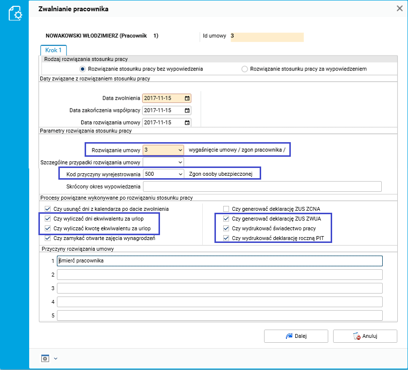 Ponadto z dniem śmierci pracownika rozwiązał stosunek pracy za pomocą procedury Zwalnianie pracownika, dostępnej z poziomu słownika Pracownicy – umowy(etaty). Zgodnie z art. 631 § 1 Kodeksu pracy jako powód rozwiązania stosunku pracy wykazał wygaśnięcie umowy spowodowane śmiercią pracownika, z kodem przyczyny wyrejestrowania 500 – zgon osoby ubezpieczonej.