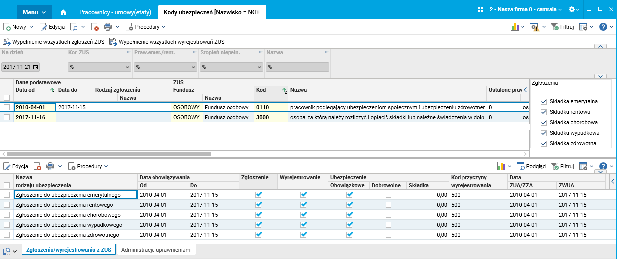 Rys. 9. Zgłoszenia/wyrejestrowania z ZUS w słowniku Kody ubezpieczeń