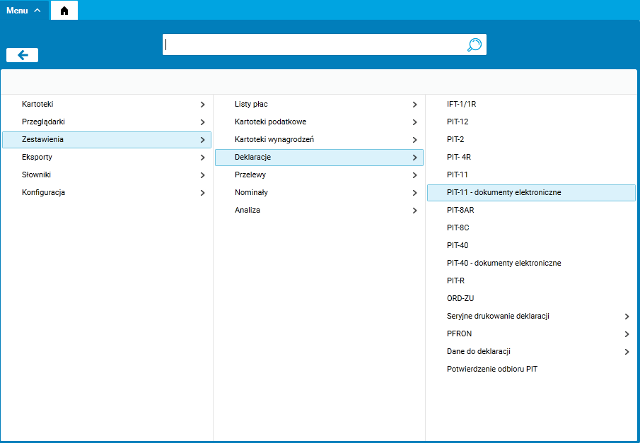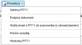 W słowniku dostępne są procedury związane z przygotowywaniem i generowaniem deklaracji w postaci elektronicznej. Pierwszym etapem jest wygenerowanie dokumentu PIT-11 za pomocą procedury Generuj PIT11, kolejnym etapem jest podpisanie go z wykorzystaniem certyfikowanego podpisu za pomocą procedury Podpisz dokument, ostatnim etapem jest wysyłka PIT-u do pracowników i/lub wydruk dokumentu.
