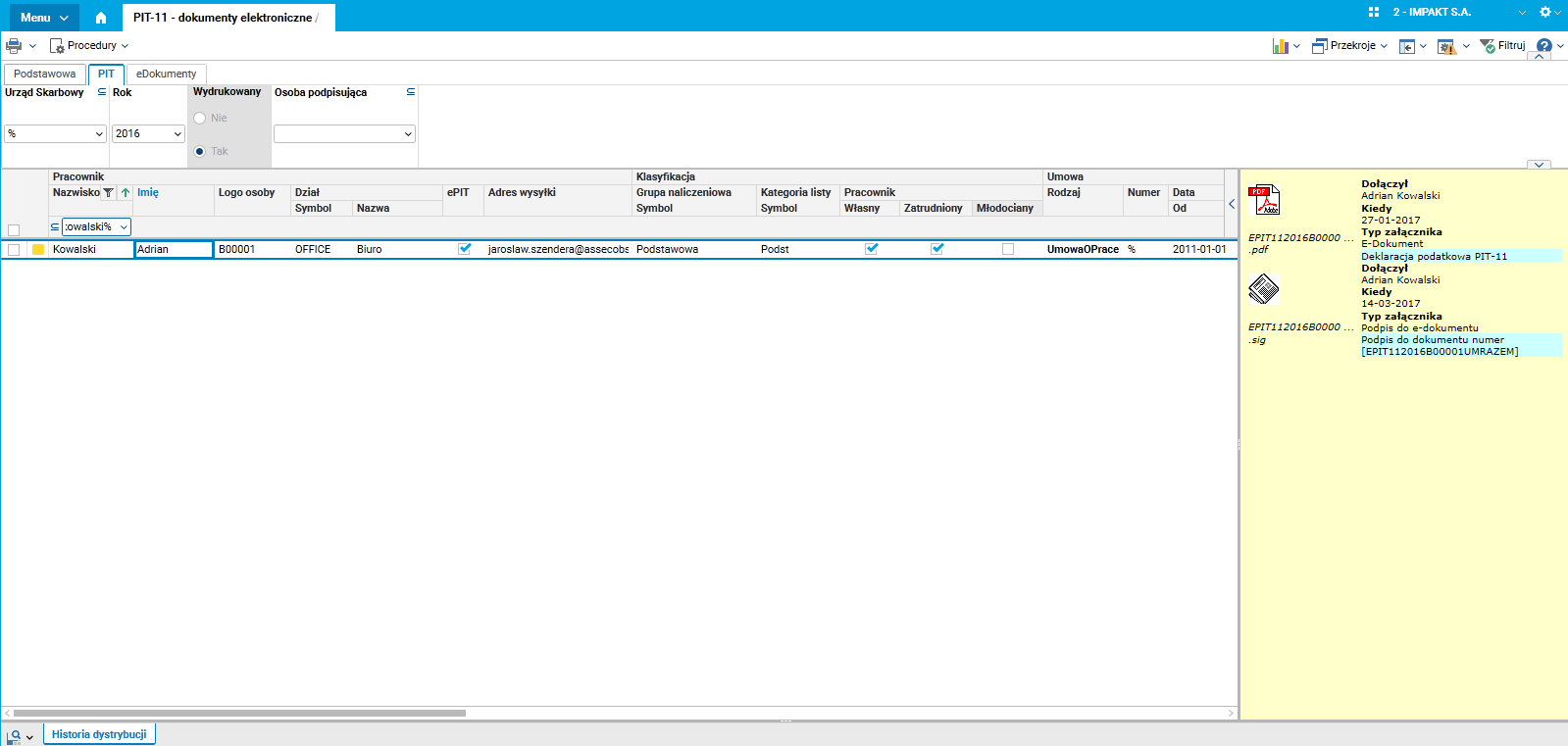 W słowniku PIT-11 – dokumenty elektroniczne dostępny jest szczegół Historia dystrybucji, pokazujący, który użytkownik, kiedy i z jakiego adresu mailowego przesłał dokument elektroniczny PIT. Dostępne są też informacje o statusie wysyłki mailowej na serwerze.