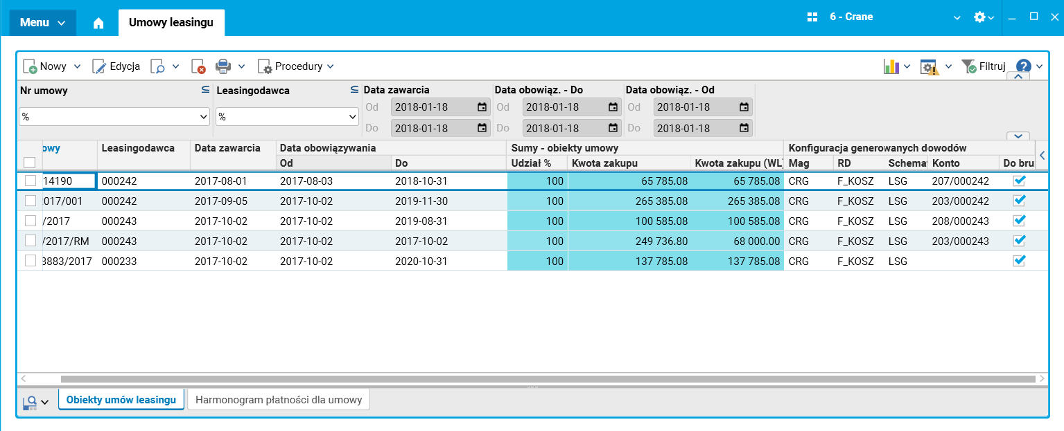 W systemie Softlab ERP by Asseco przygotowana została funkcjonalność, która pozwala zaewidencjonować umowę leasingową oraz obsłużyć ją w zakupie.