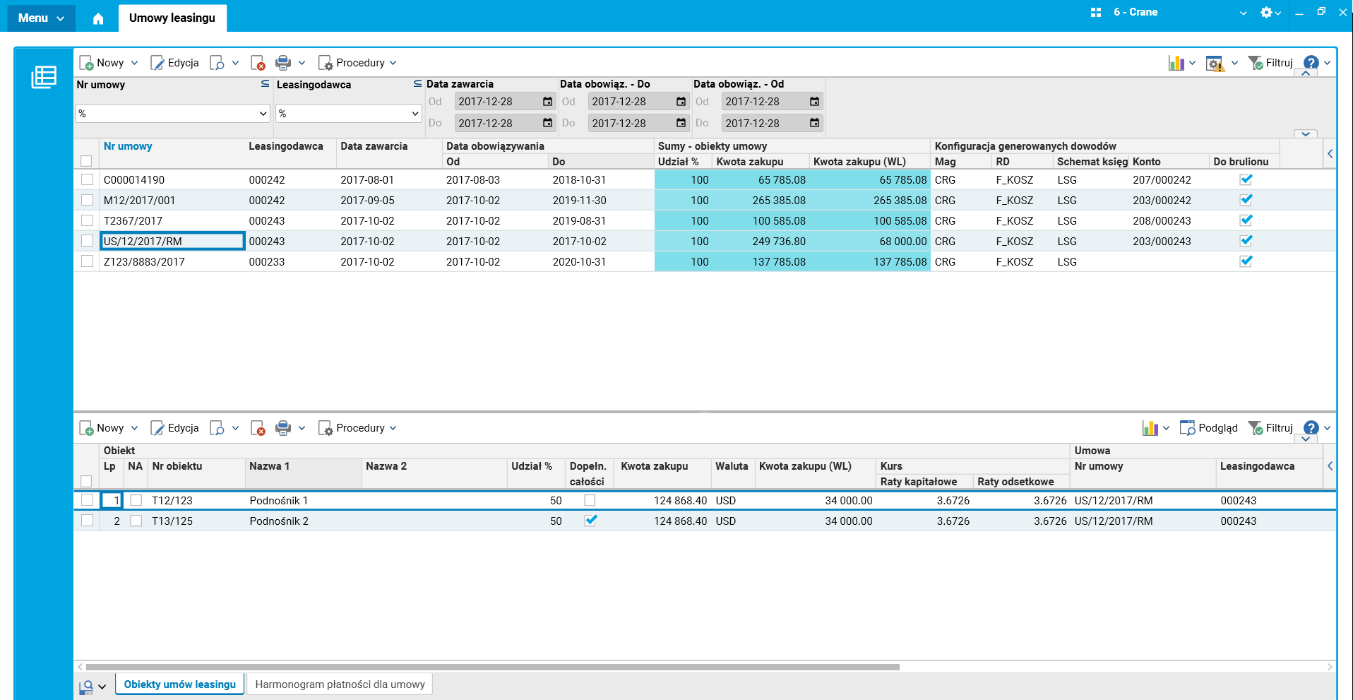 Słownik Umowy leasingowe pozwala na zarejestrowanie numeru umowy, daty zawarcia umowy, czasu jej obowiązywania oraz umożliwia utworzenie harmonogramu płatności w rozbiciu na miesiące.
