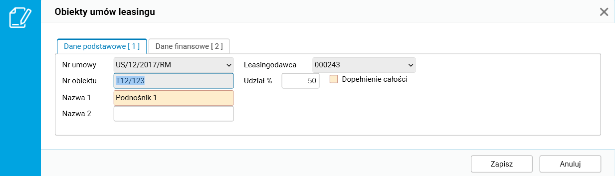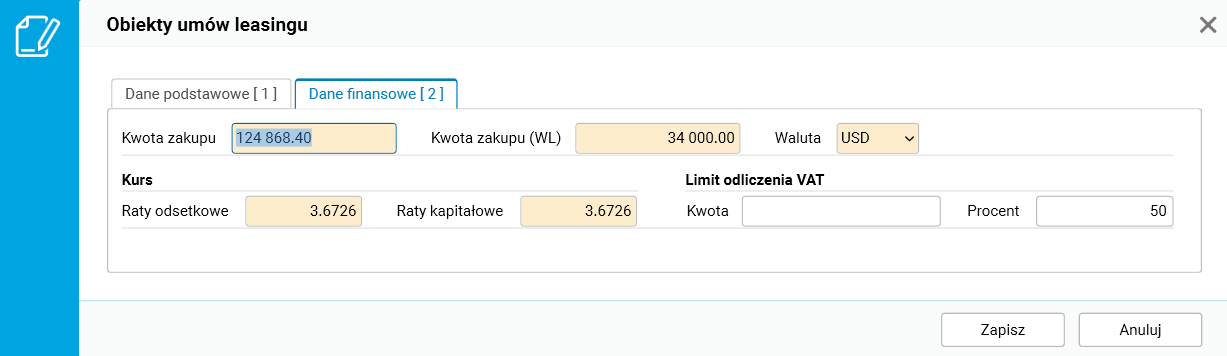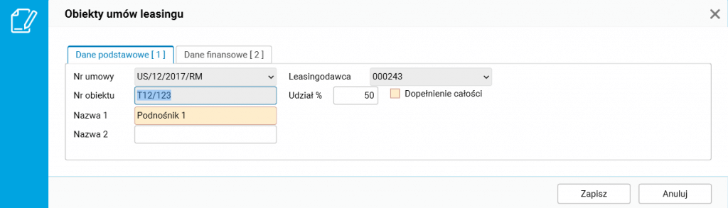 Po zarejestrowaniu umowy należy określić przedmiot leasingu (szczegół Obiekty umów leasingu), podając jego numer, nazwę, wartość zakupu oraz informacje o możliwości odliczenia podatku VAT.