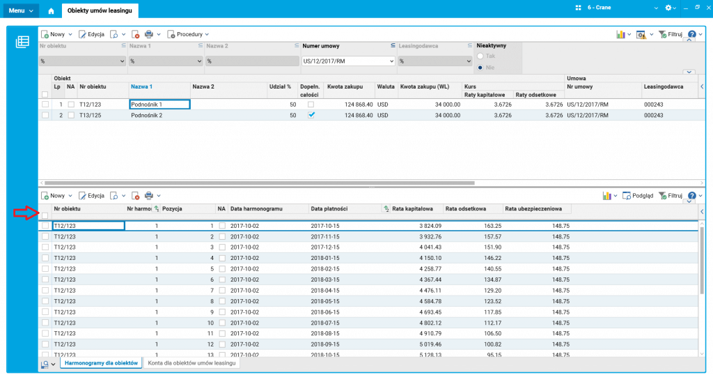 W kolejnym kroku należy wprowadzić harmonogram płatności, w którym dokonujemy podziału kwoty netto na część związaną z ratą kapitałową, odsetkową oraz ubezpieczeniową (szczegół Harmonogram dla obiektów). Harmonogram można wprowadzić ręcznie lub zaimportować z pliku XLS.