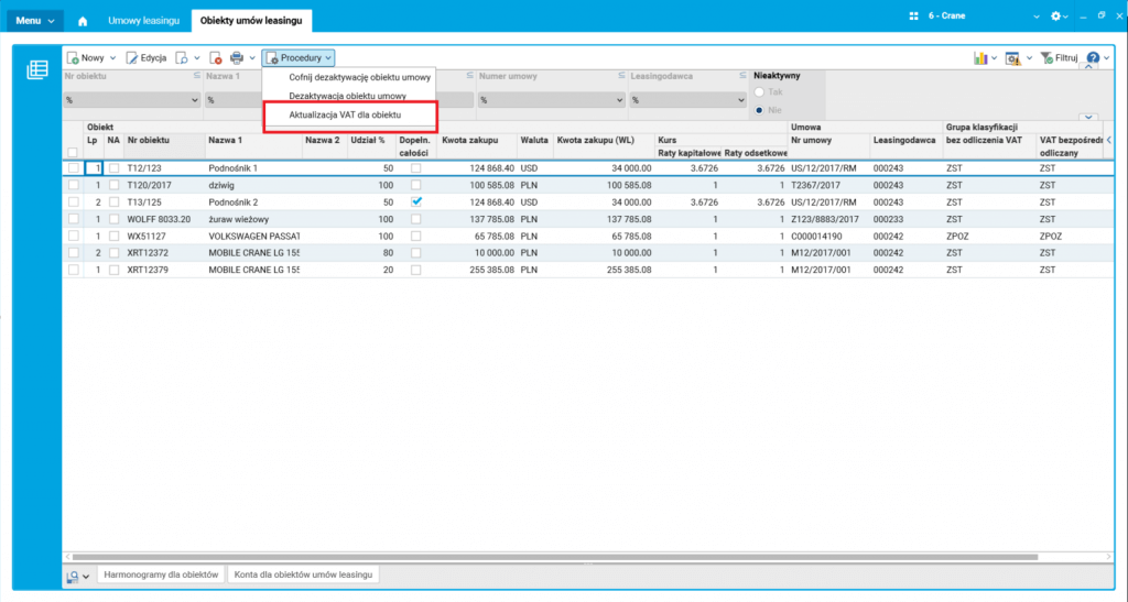 Ostatnim krokiem jest uruchomienie procedury Aktualizuj VAT dla obiektu w słowniku Obiekty umów leasingu. Procedura ta przeliczy i wypełni związane z umowami harmonogramy płatności, z uwzględnieniem podziału elementy opłaty leasingowej oraz VAT odliczany bezpośrednio i bez odliczenia, zgodnie z limitami określonymi dla poszczególnych umów.