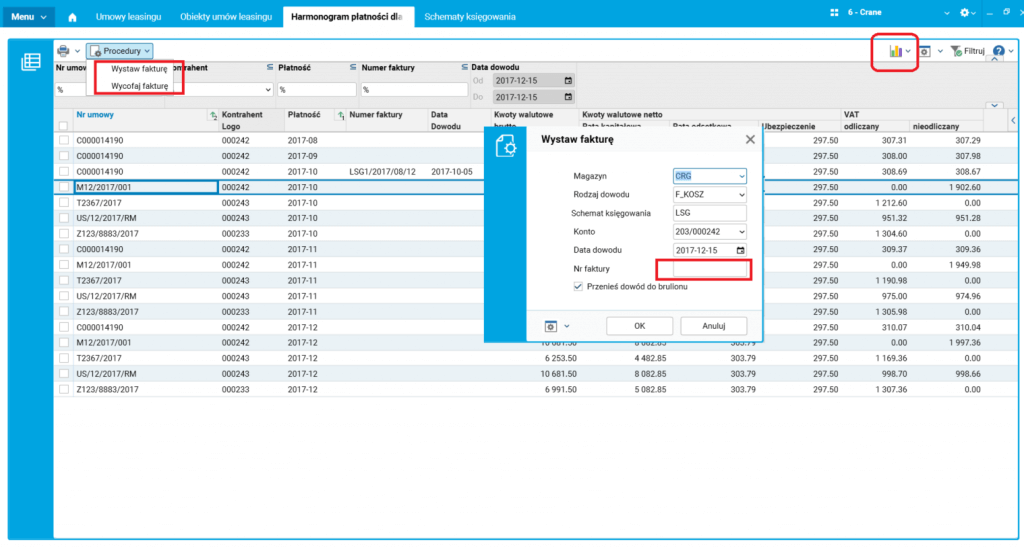Rys. 7. Wystawienie faktury z harmonogramu płatności dla umowy leasingowej