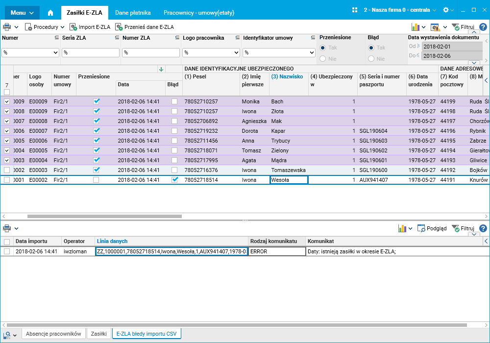 Wykaz błędów dostępny jest w szczególe E-ZLA błędy importu CSV w słowniku Zasiłki E-ZLA.