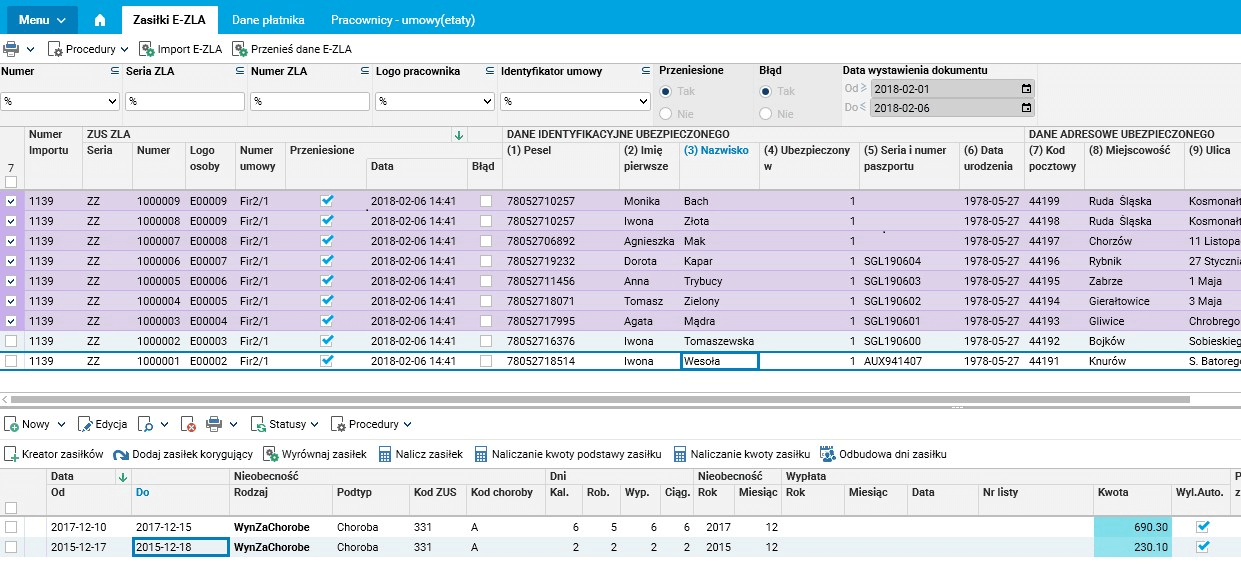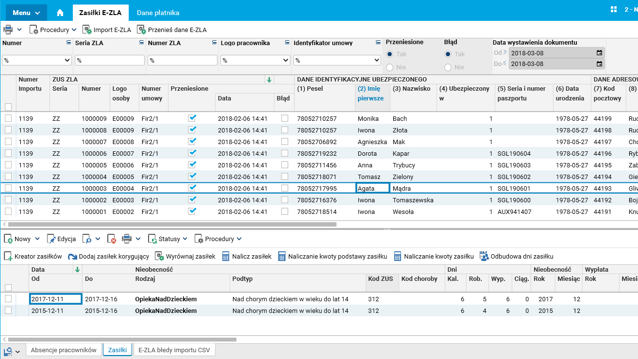 Z poziomu słownika Zasiłki E-ZLA pracownik może zobaczyć historię zaimportowanych zasiłków, jak również dane o absencjach przeniesionych do Kartoteki zasiłków.