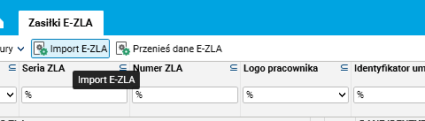 Pracownik działu kadr otwiera słownik Zasiłki E-ZLA. Po wejściu do słownika uruchamia procedurę Import E-ZLA.