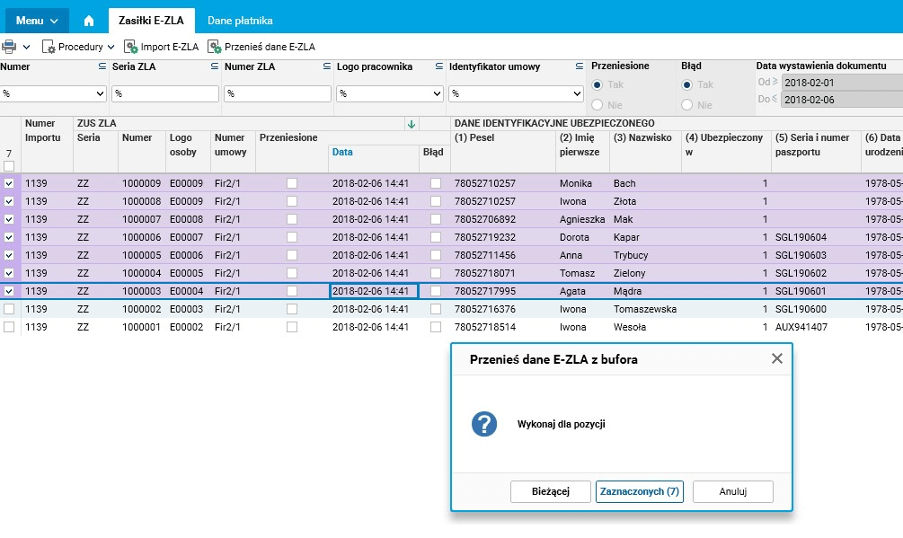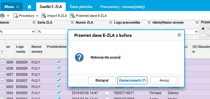 W słowniku Zasiłki E-ZLA użytkownik wskazuje wybrane zwolnienia (po wcześniejszej weryfikacji). Następnie uruchamia procedurę Przenieś dane E-ZLA dla wybranych zwolnień.