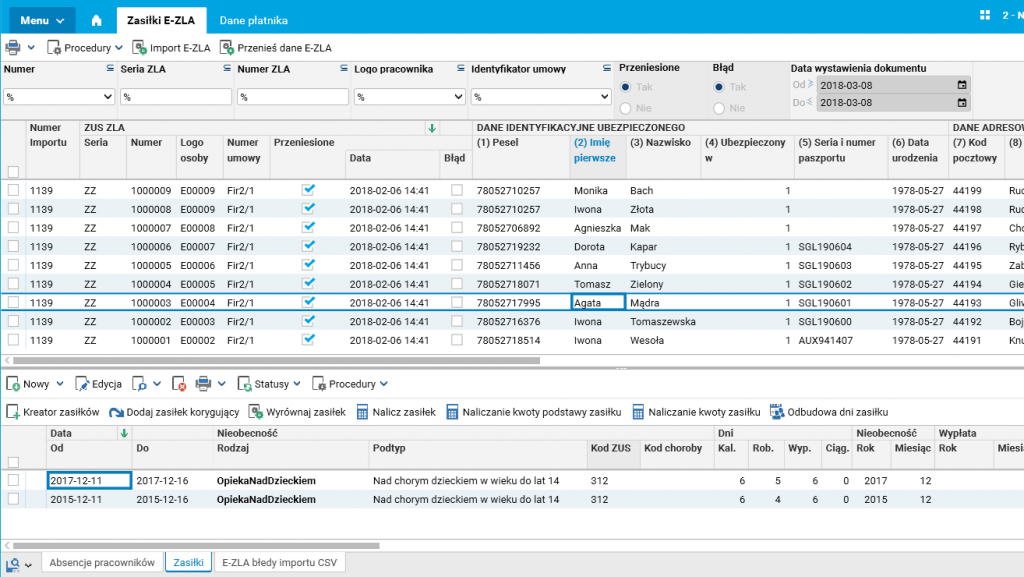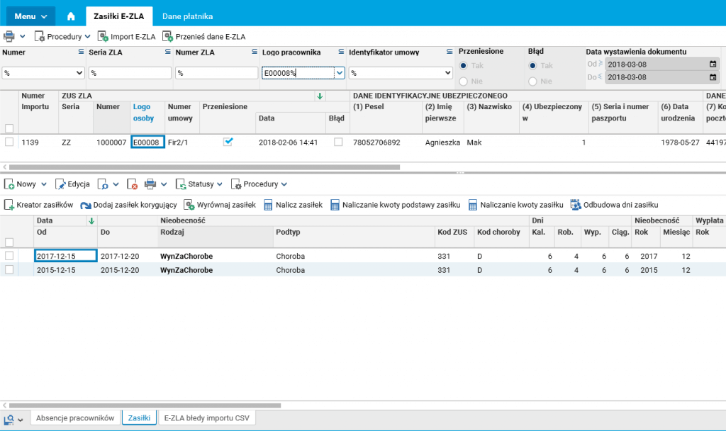 - czy w momencie importu zasiłku w systemie są zarejestrowane dane pracownika na datę nieobecności (sprawdzanie polega na weryfikacji pola PESEL),